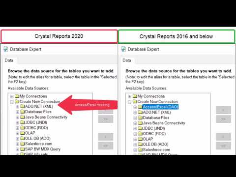 The last couple of versions of Crystal Reports, 2016 and 2020, have seen a significant change in regard to connecting to data sources. Specifically, the ability to connect to Microsoft Access databases and Excel workbooks has changed. For Crystal Reports 2016 and earlier, the connection called “Access/Excel DAO” should still be available. Some versions are 32-bit and can still use the Microsoft Data Access Objects connector. When going into the Database Expert, this item should be available on the left side of the dialog box (“Available Data Sources”).